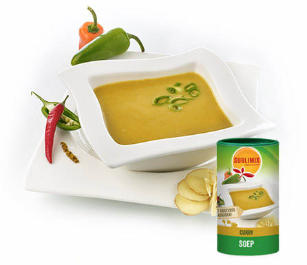 Een hartig en gezond tussendoortje: los een eetlepel Sublimix Currysoep/-Saus op in een koffietas, een minuutje roeren en klaar! Wil je een saus bij je kip of rijst? Maak dan eens een currysaus met de Sublimix Currysoep/-Saus. Snel klaar en verrassend lekker.